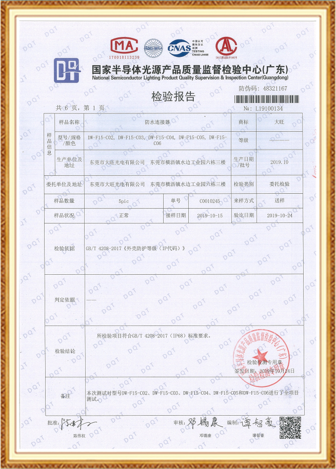 防水連接器 CQC證書