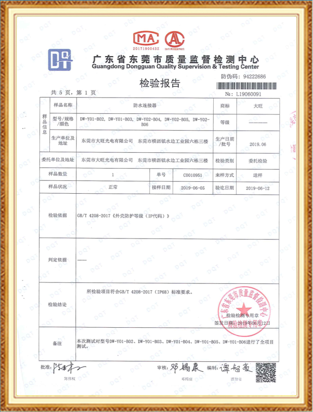 防水連接器CQC證書